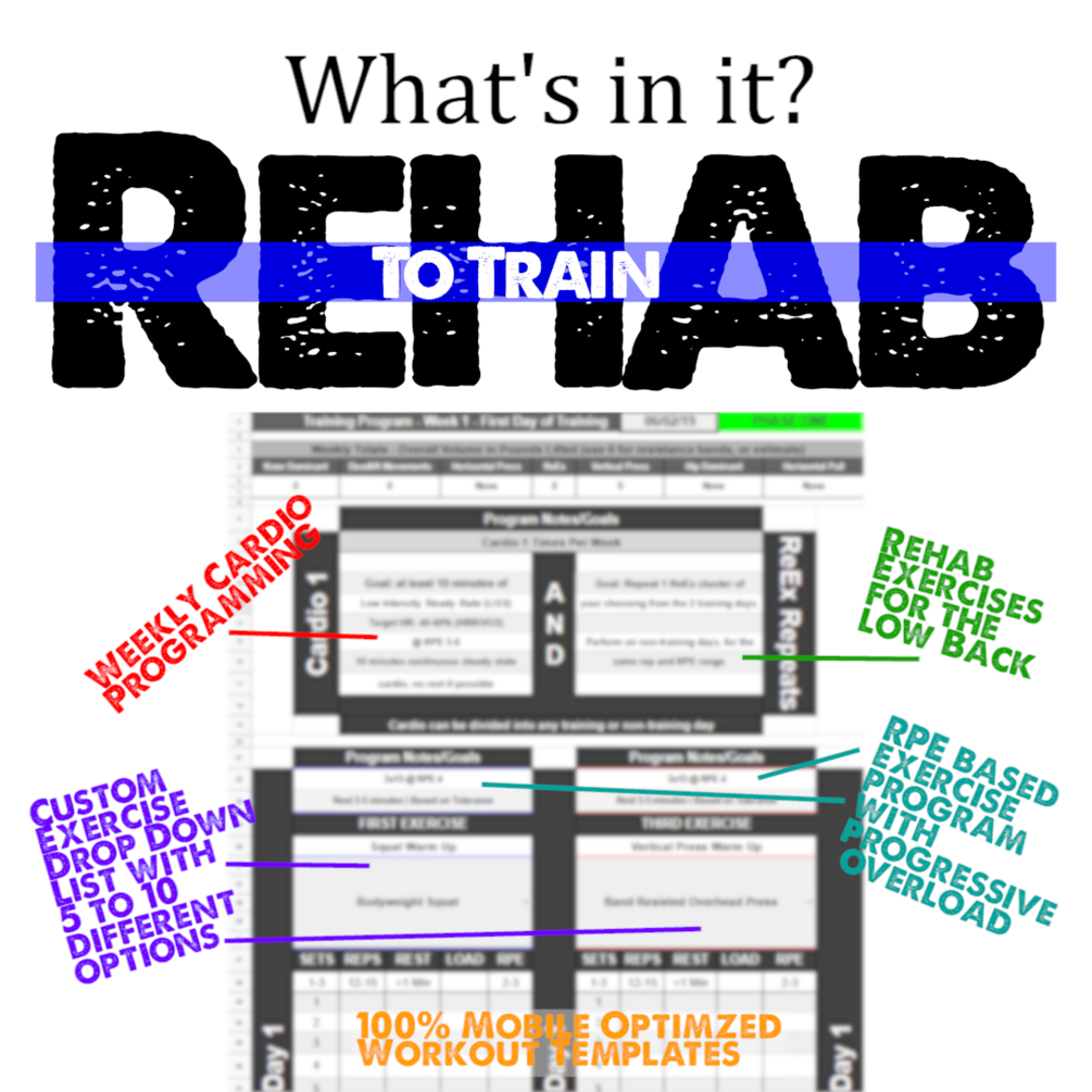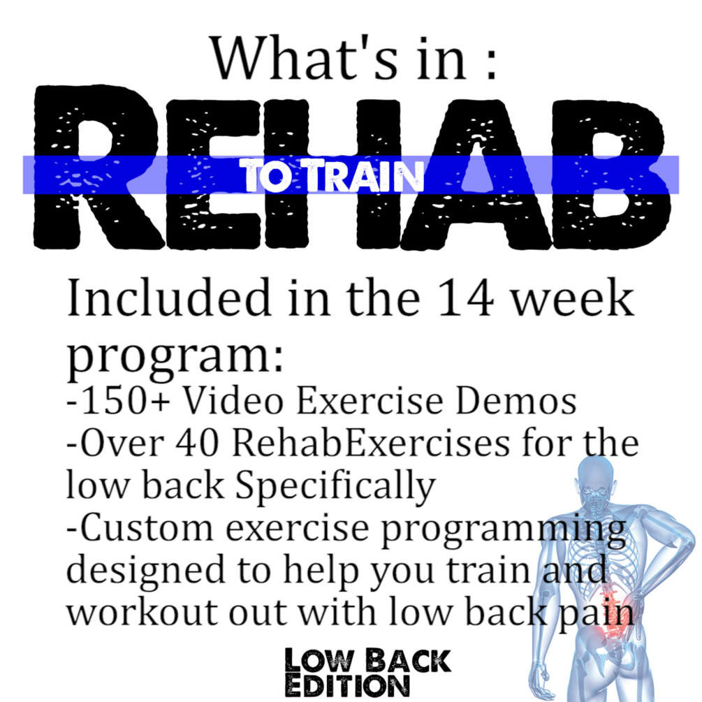 Rehab To Train is a 14 week fully customizable exercise template. It is 14 full weeks of training to help you go from Rehab/limited exercise/restrictions to fully exercising and training without needing to modify because of your low back.